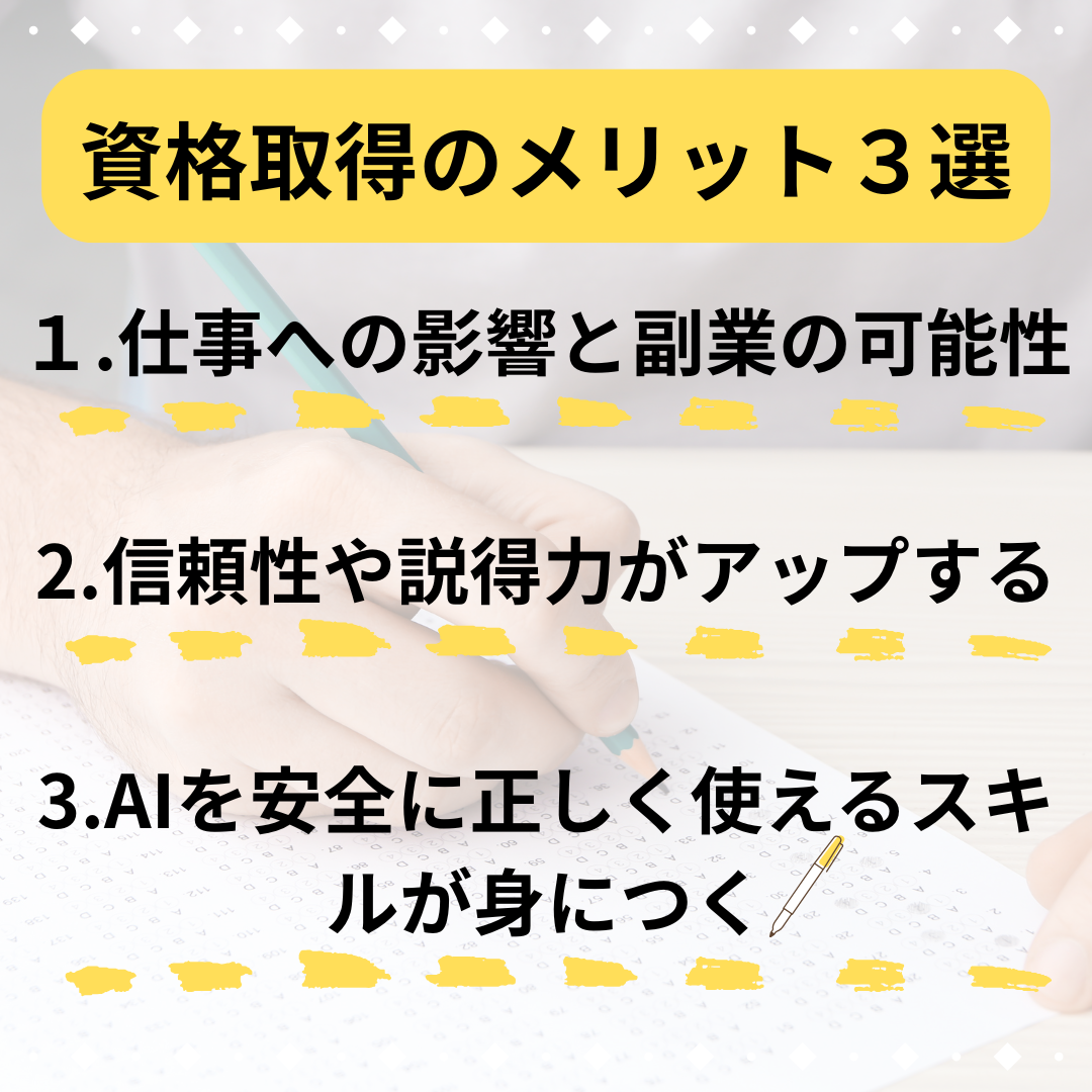 この資格を勉強すると、どこに注意すれば安全かがちゃんとわかるので、迷わずAIを使えるようになります。
