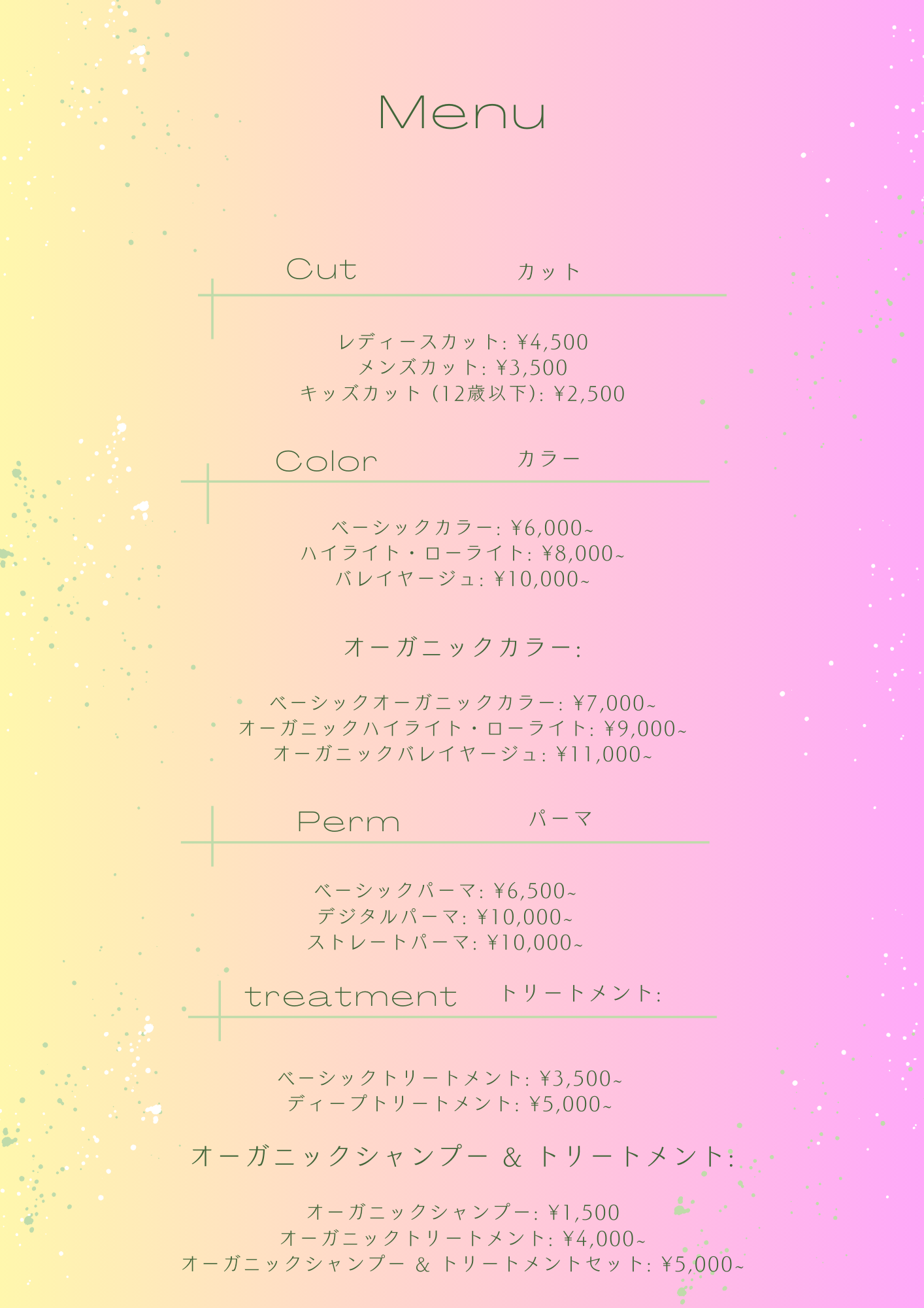 - オーガニックカラー & カット & トリートメント: ¥15,000~