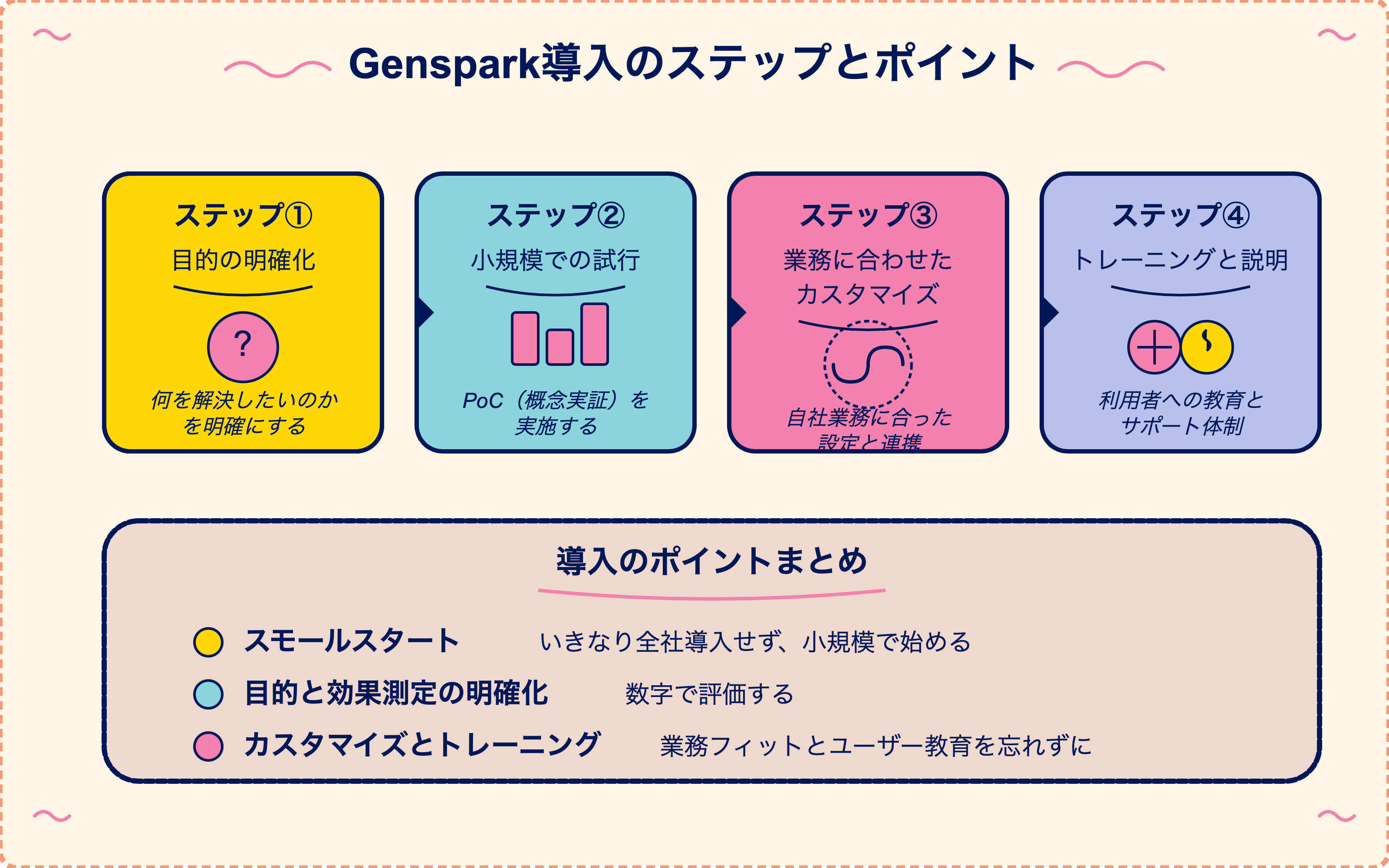 Gensparkは汎用型のAIですが、自社の業務に合った設定や連携(API接続など)を行うことで、より効果的に使えるようになります。