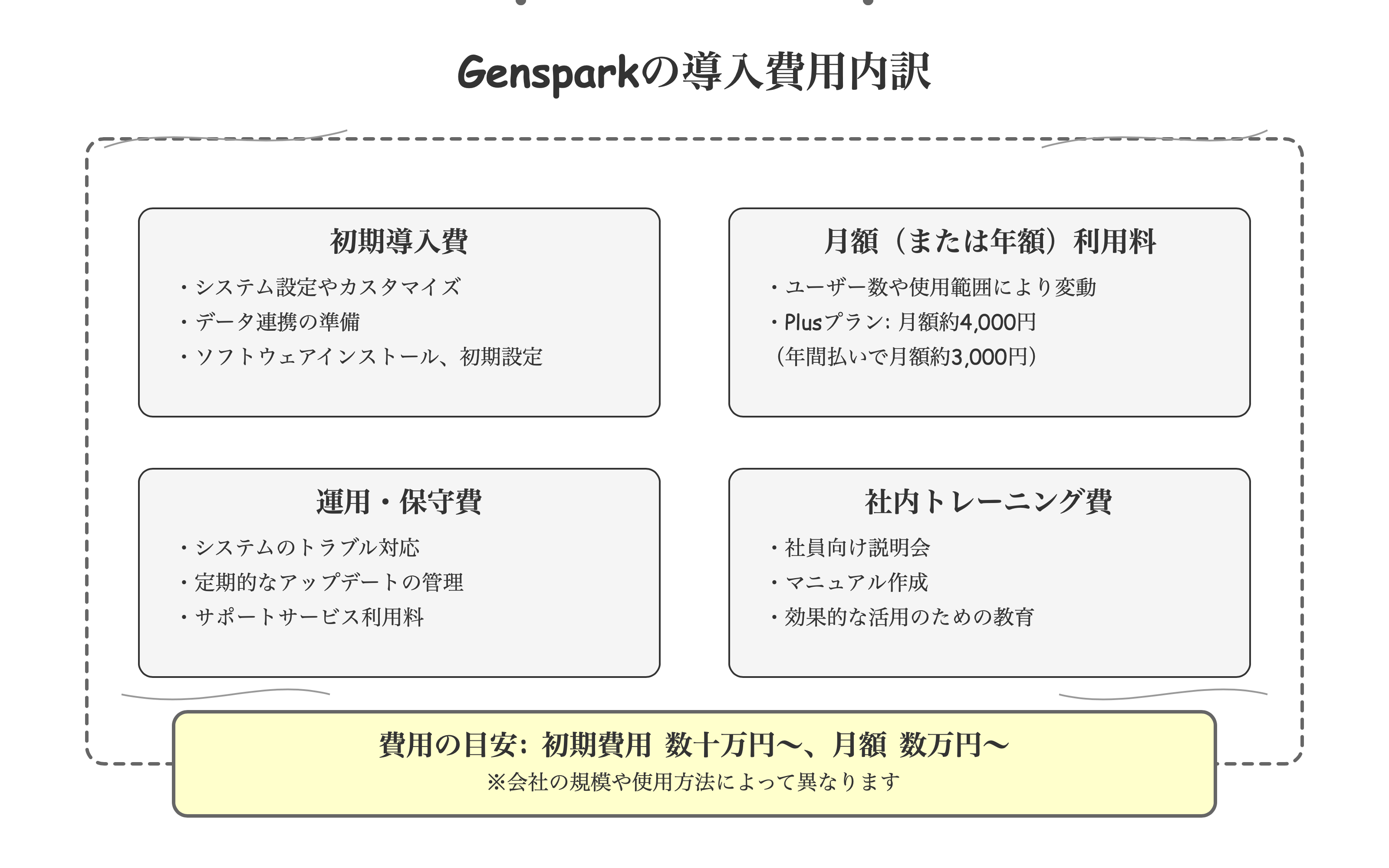 Gensparkの導入には、主に以下のような費用がかかります(大体の目安)