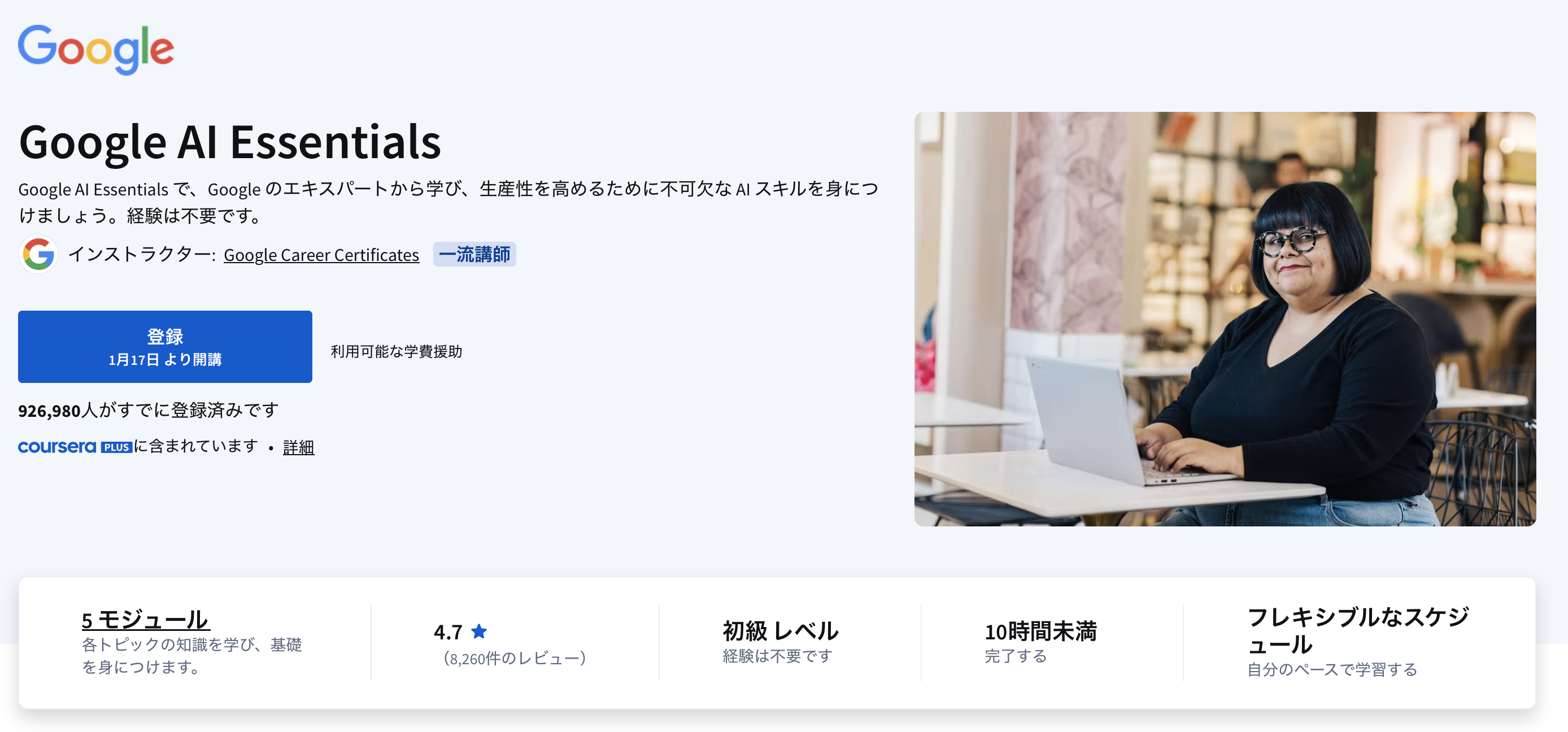 なお、2024年12月9日の発表によれば、通常の受講料は、約8,000円ですが、新規会員を対象に先着4,000名に「Google AI Essentials」コースの無料受講枠が提供されています。