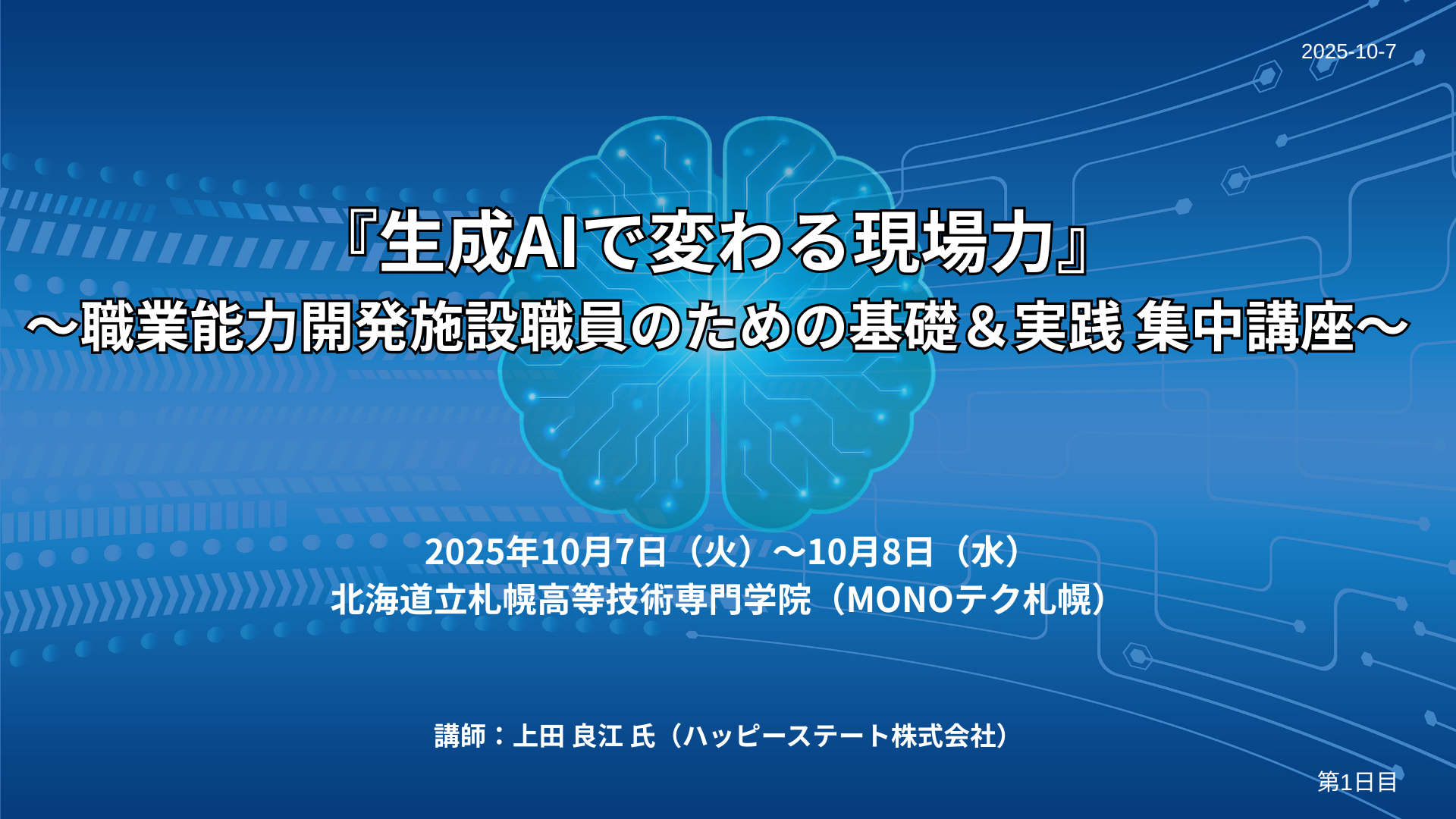 今回の研修「生成AIで変わる現場力〜職業能力開発施設職員のための基礎&実践集中講座〜」は、