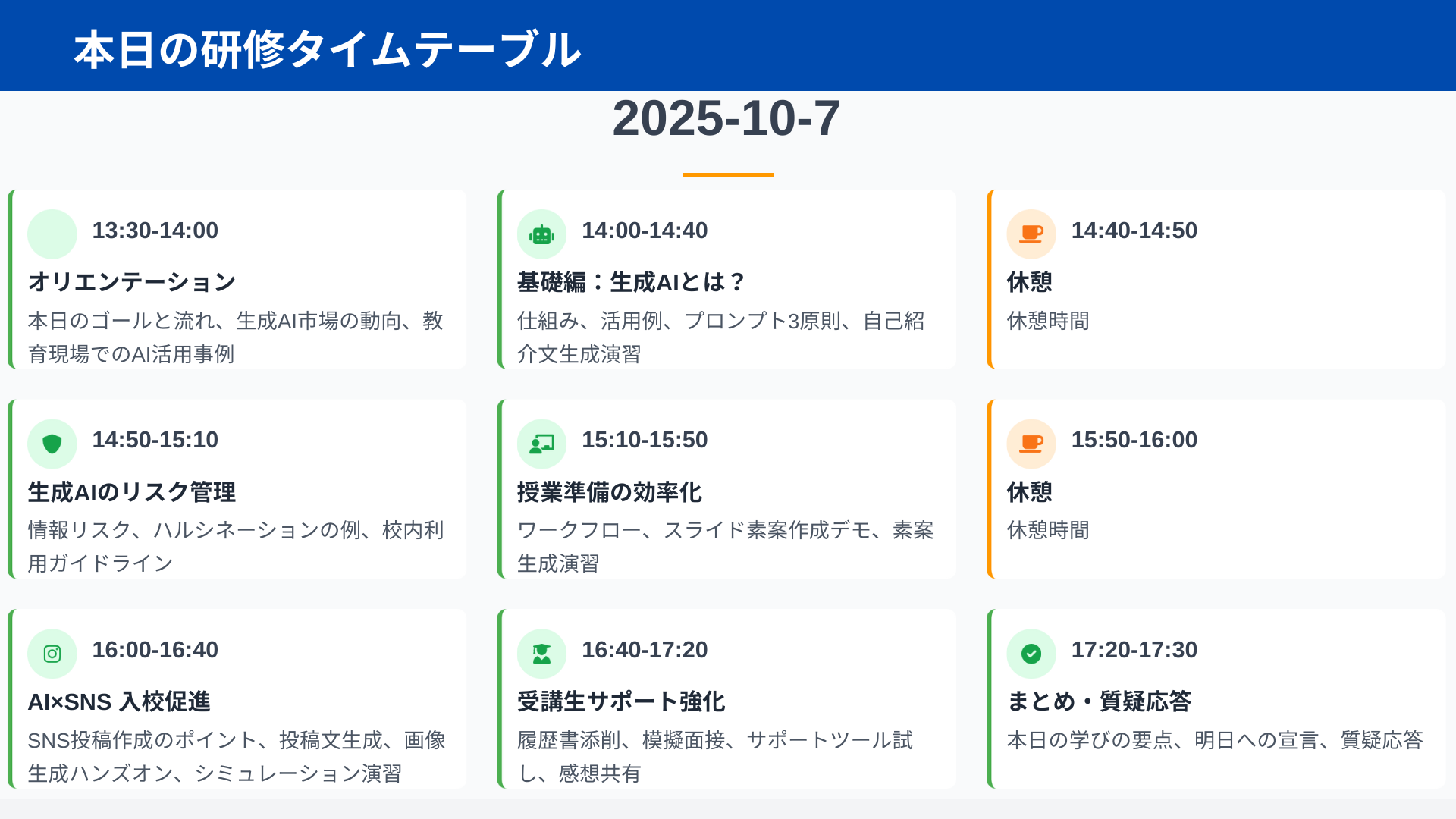 | 10月7日(火) | 13:30〜13:40 | 開講式・オリエンテーション | 研修概要説明・目的共有 |
